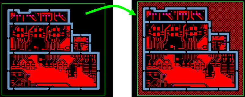 另一個(gè)例子是“銅平衡” - 許多PCB設(shè)計(jì)使用大面積銅區(qū),如果將PCB放入面板以輔助制造過程,則會(huì)導(dǎo)致銅不平衡。 這可能會(huì)導(dǎo)致面板在回流期間發(fā)生翹曲,因此推薦的解決方案是在面板的廢棄區(qū)域添加“銅平衡”,如下所示: -