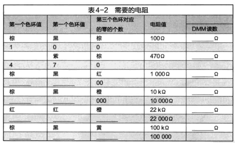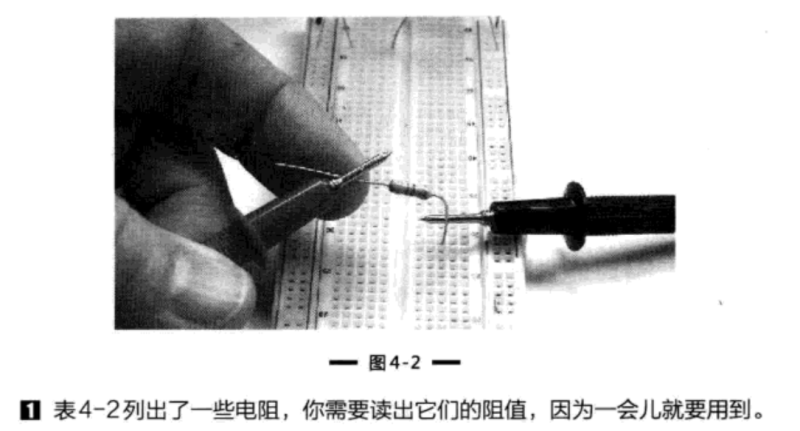 圖4-2給出了如何測■電阻的方法。首先,將電阻的一支管腳插到面包板上,用