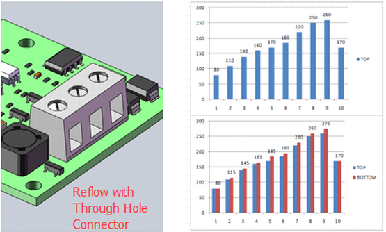 在大多數(shù)情況下,回流爐的熱設(shè)定點(diǎn)對(duì)于同一區(qū)域內(nèi)的頂部和底部加熱元件都是相同的。 但有些特殊情況需要對(duì)TOP和BOTTOM元件應(yīng)用不同的溫度設(shè)置。 SMT工藝工程師應(yīng)該檢查特定的電路板要求以確定正確的設(shè)置。 一般來(lái)說(shuō),以下是設(shè)定加熱元件溫度的一些指導(dǎo)原則: 如果電路板上有通孔(TH)元件,并且您想用SMT元件將它們一起回流,則可能需要考慮增加底部元件的溫度,因?yàn)門H元件會(huì)阻塞頂部的熱空氣循環(huán),從而阻止TH元件下方的焊盤接受足夠的熱量以形成良好的焊接接頭。 大多數(shù)TH連接器外殼由塑料制成,一旦溫度變得太高,塑料就會(huì)熔化。 過程工程師必須先執(zhí)行測(cè)試并檢查結(jié)果。