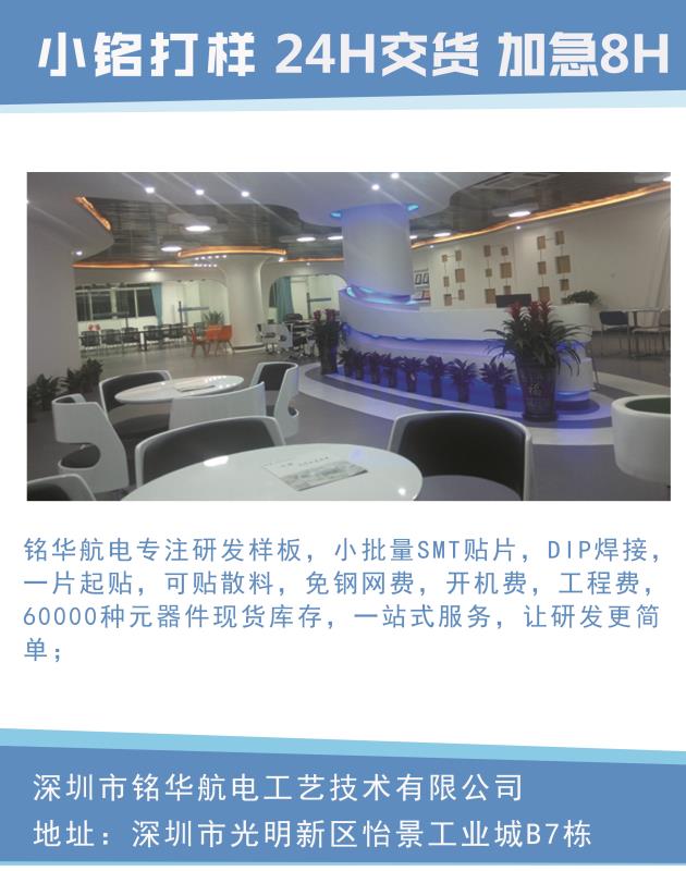 銘華航電是一家專業(yè)為電子行業(yè)創(chuàng)新型研發(fā)公司服務的平臺,我們提供包括研發(fā)方案平臺、物料選型、樣板制作、小批量制作、檢測等服務內(nèi)容,提 升研發(fā)效益。